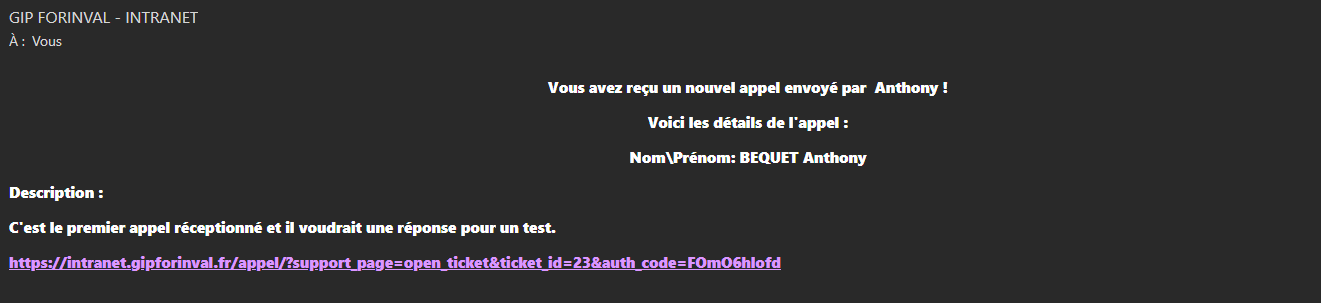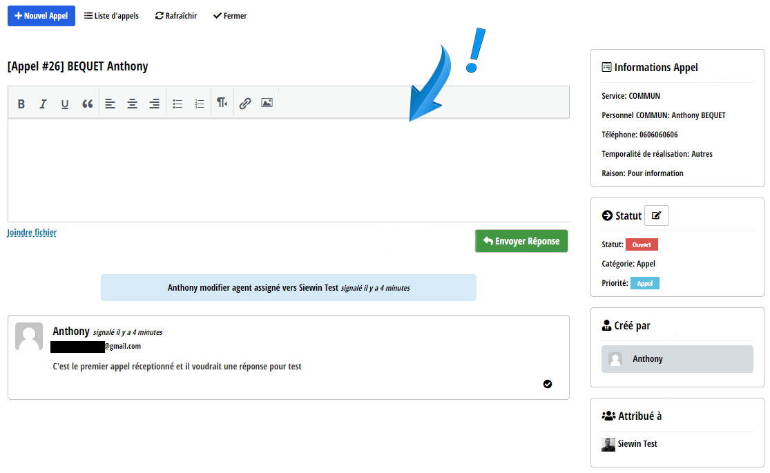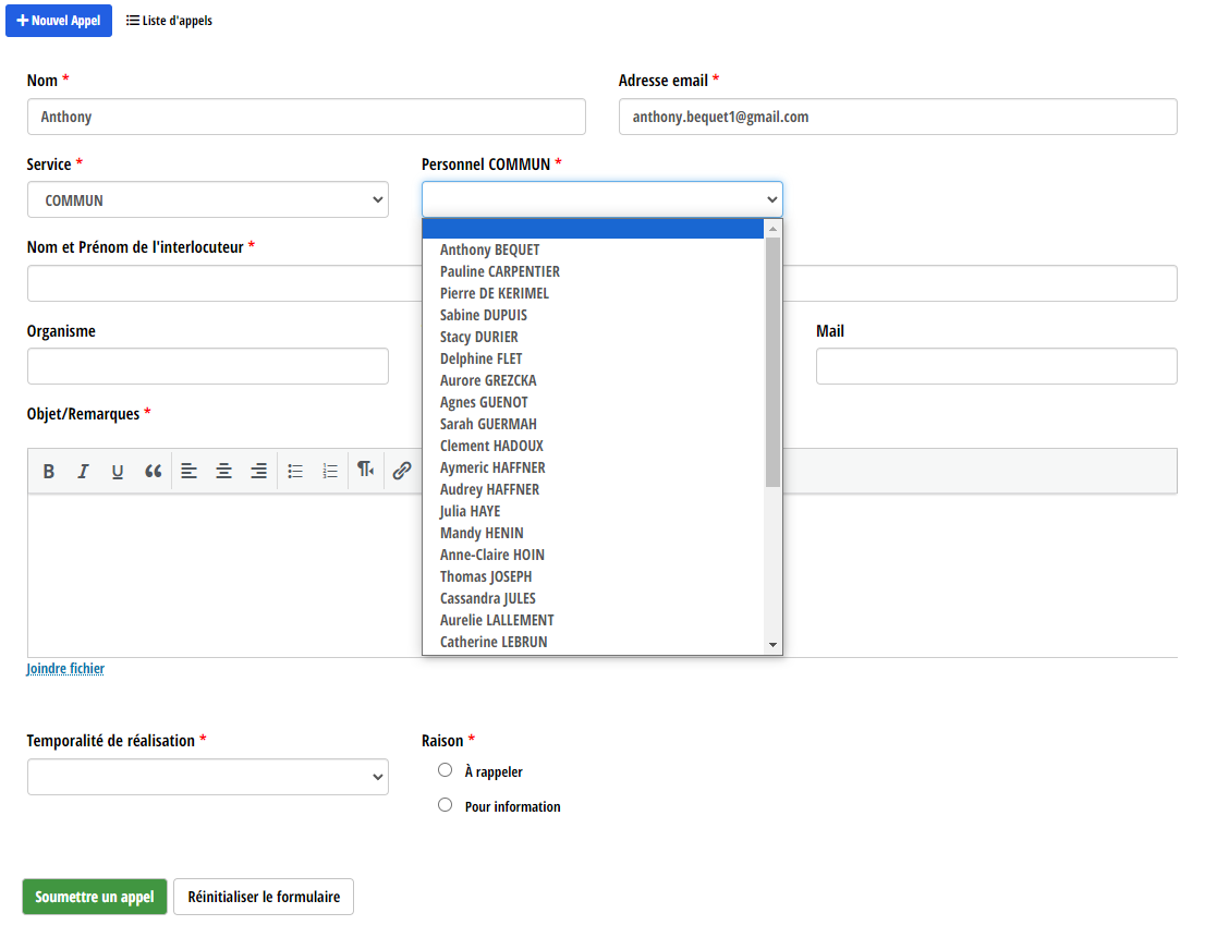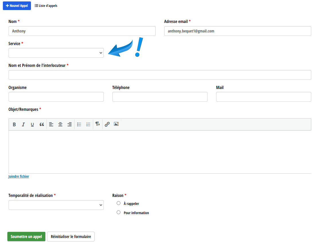 Raison :À rappeler(Rappeler ou contacter par mail, fermer l’appel une fois abouti en envoyant une réponse) \ Pour information( Pas d’obligations de rappel ou contact et l’appel se fermera automatiquement )