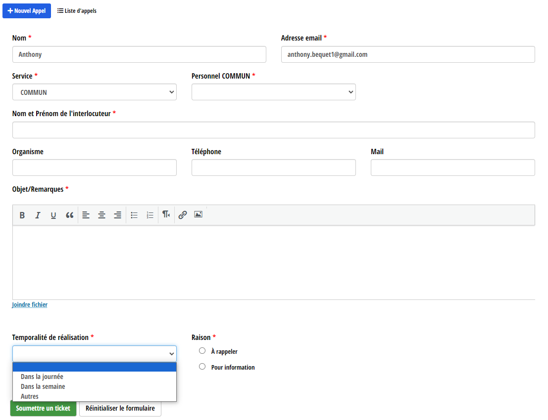 Temporalité de réalisation : Sélectionner si l’appel à un besoin de rappelle ( Dans la journée, Dans la semaine, Autres ( Pas de limite de temps et fermeture automatique ) )